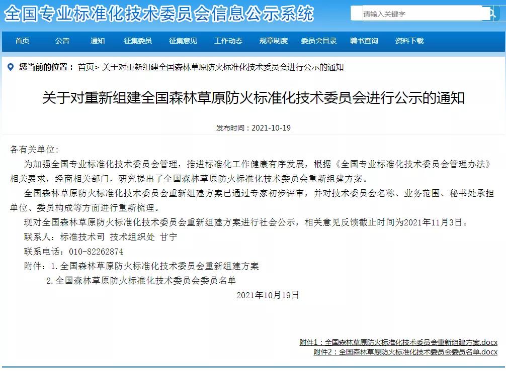 近日,全国专业标准化技术委员会信息公示系统对重新组建全国森林草原防火标准化技术委员会进行了公示通知。